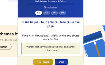 Ejiogbe Proverbs Yoruba - Daily Wisdom är en webbläsartillägg som ger användare tillgång till en rik samling av över 400 traditionella Yoruba-ordspråk. Denna tillägg är utformad för att bevara och sprida Yoruba-kulturens visdom genom dagliga insikter och kulturell utbildning. Varje ordspråk presenteras med sin ursprungliga text och översättning, vilket gör det lättare för användare att förstå den djupare meningen bakom orden. Med stöd för flera språk, inklusive engelska och spanska, är den tillgänglig för en bred publik som vill utforska afrikansk filosofi och traditioner.